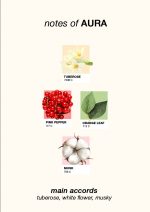 AGNES AURA, deniz rüzgârının taşıdığı beyaz çiçeklerin hafifliğini sunar. Tüberoz ve yaseminin zarif birleşimi, sakin ama büyüleyici bir atmosfer yaratır. Ferahlık ve dinginlik hissi, her nefeste yeniden doğar. Bu koku, içsel huzuru zarafetle birleştiren kadınların imgesidir.